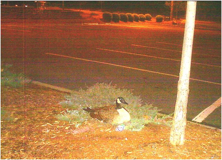 John and I went to meet my former boss and co-worker, now our good friend, at a restaurant in North Carolina. As we waited, I noticed a goose sitting in the median next to a small bush, on mulch and tossed out French fries.