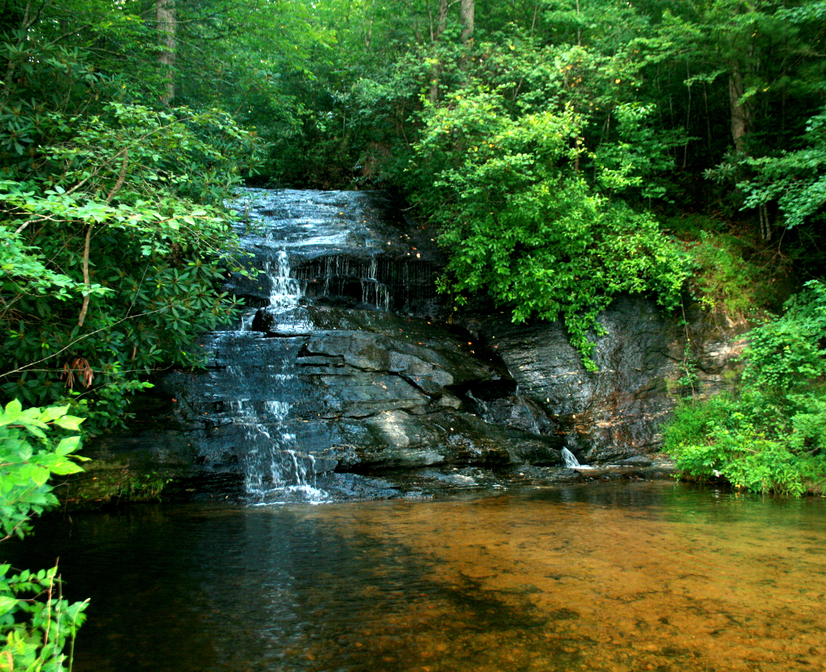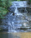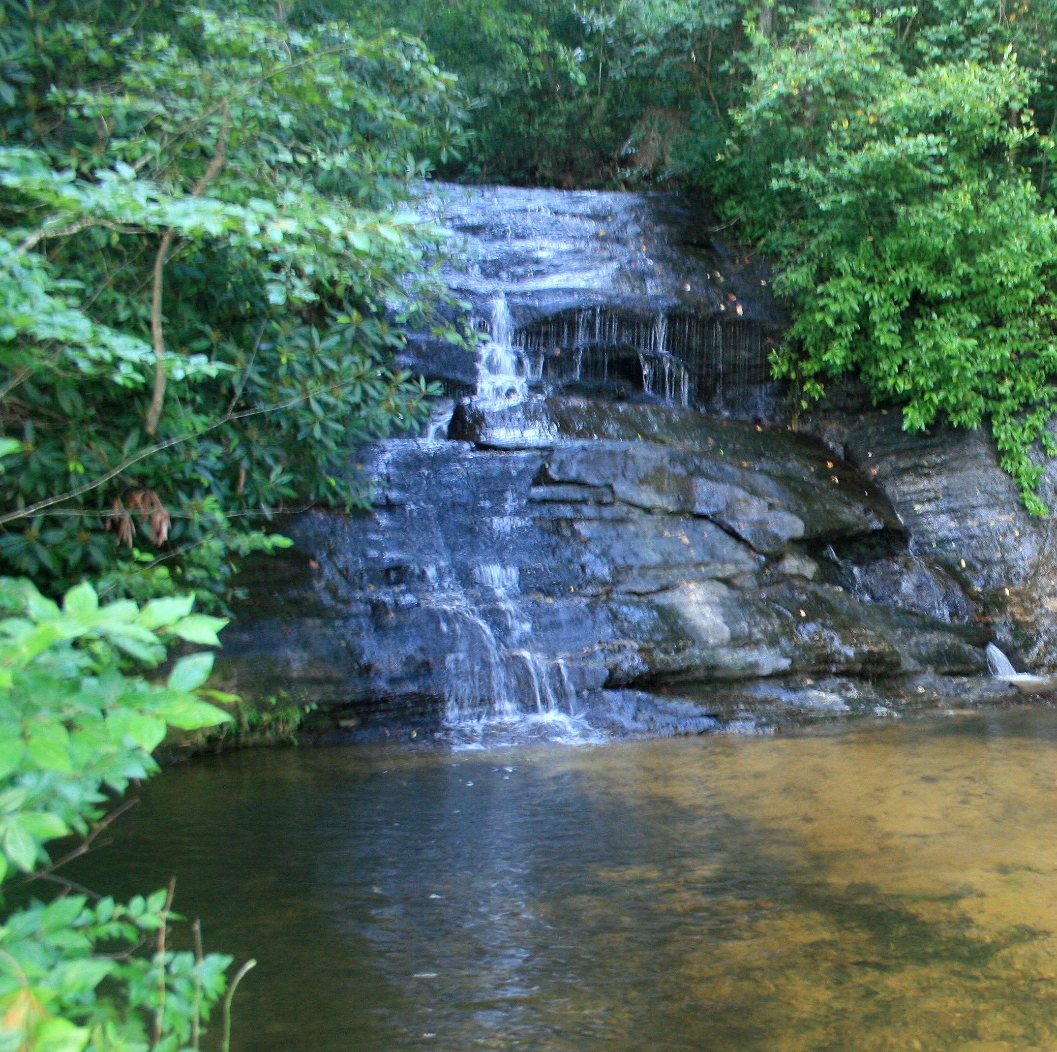 Wildcat Branch Falls sits off the side of the road. Stone steps lead to a higher waterfall.