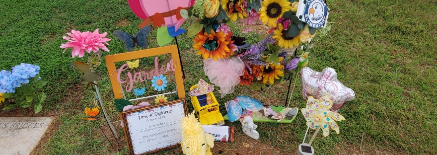 The wreath and her princess balloon for the first day of school were in the car ready to go Sunday night. I drove like a NASCAR driver to the cemetery. It's amazing I wasn't pulled.