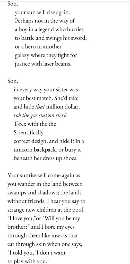 The excerpt I shared above comes from “Your Sun will Rise Again,” written for my son. It is written in recognition of a child who will journey through his toughest years without his best friend. It is dedicated to a boy who must overcome the odds in his grief unique to a child with autism and ADHD.