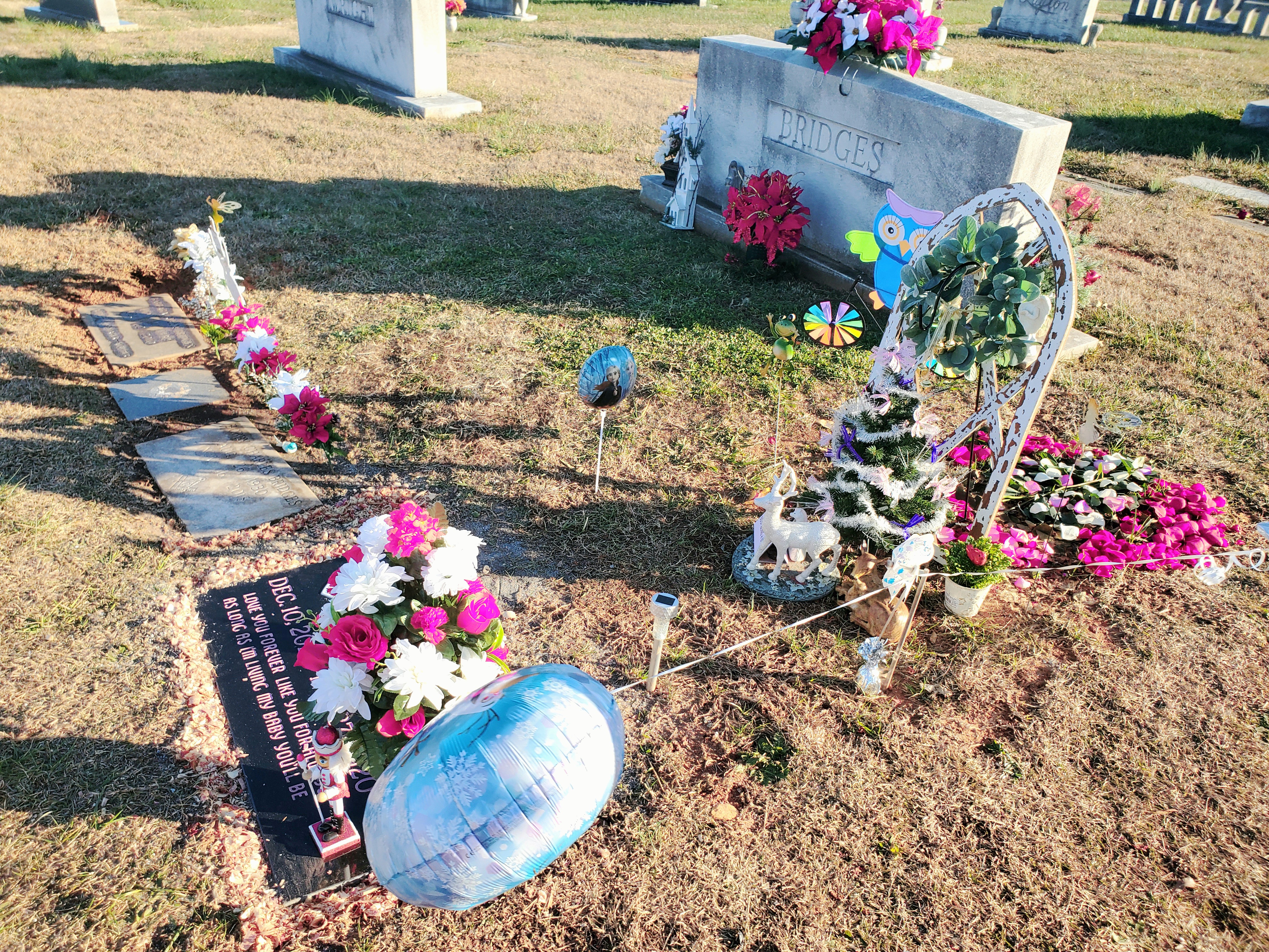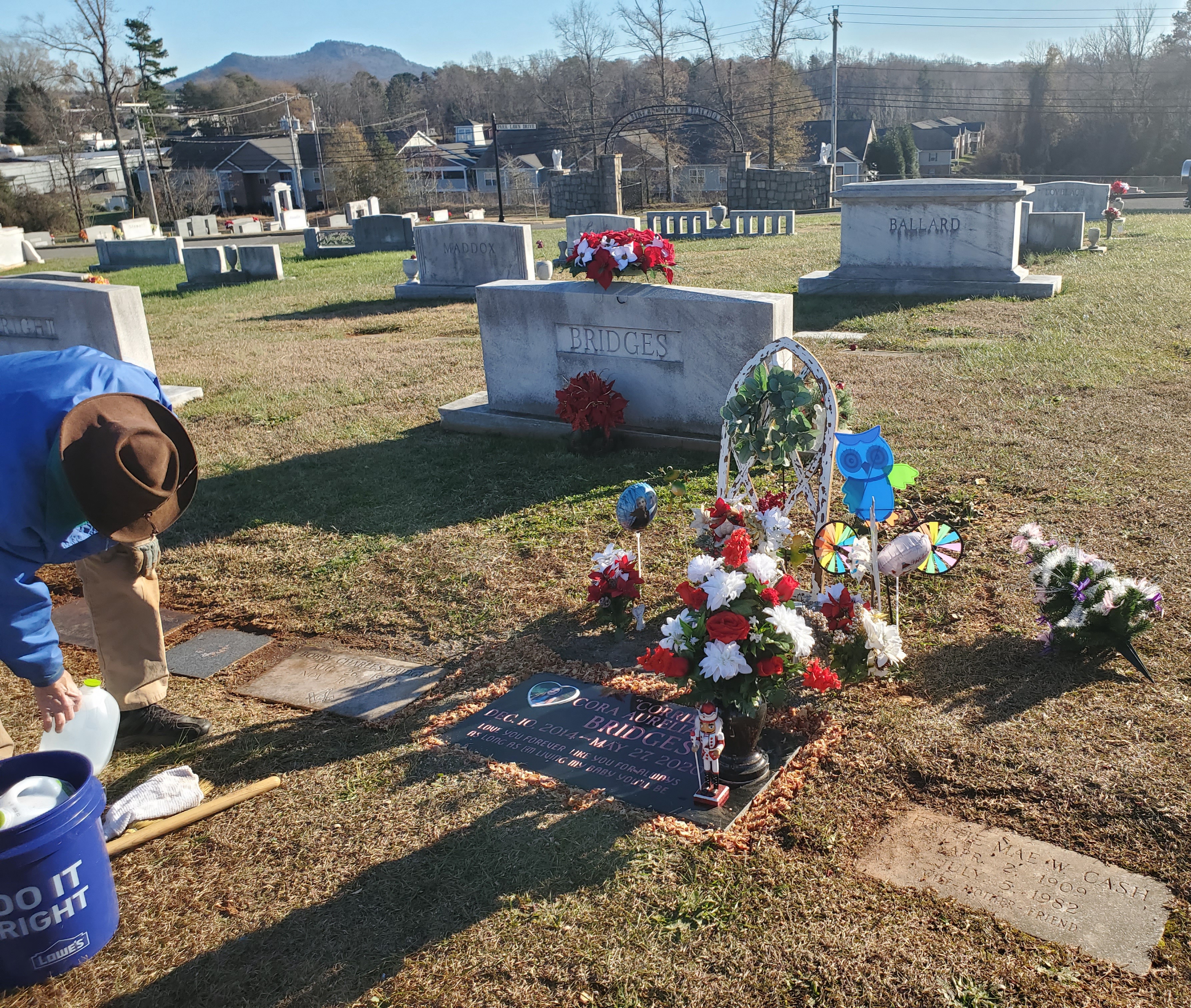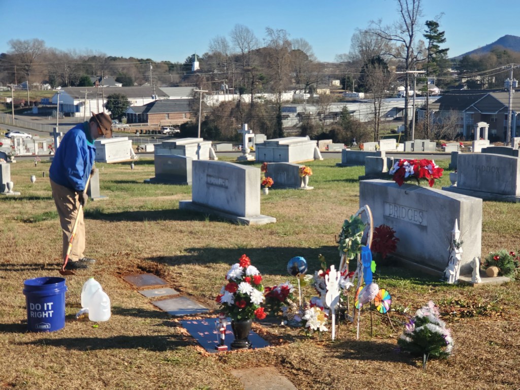 My husband cleaned her and her grandparents’ graves after a bad storm swept a bunch of dirt and the loose gravel packed around her new marker.