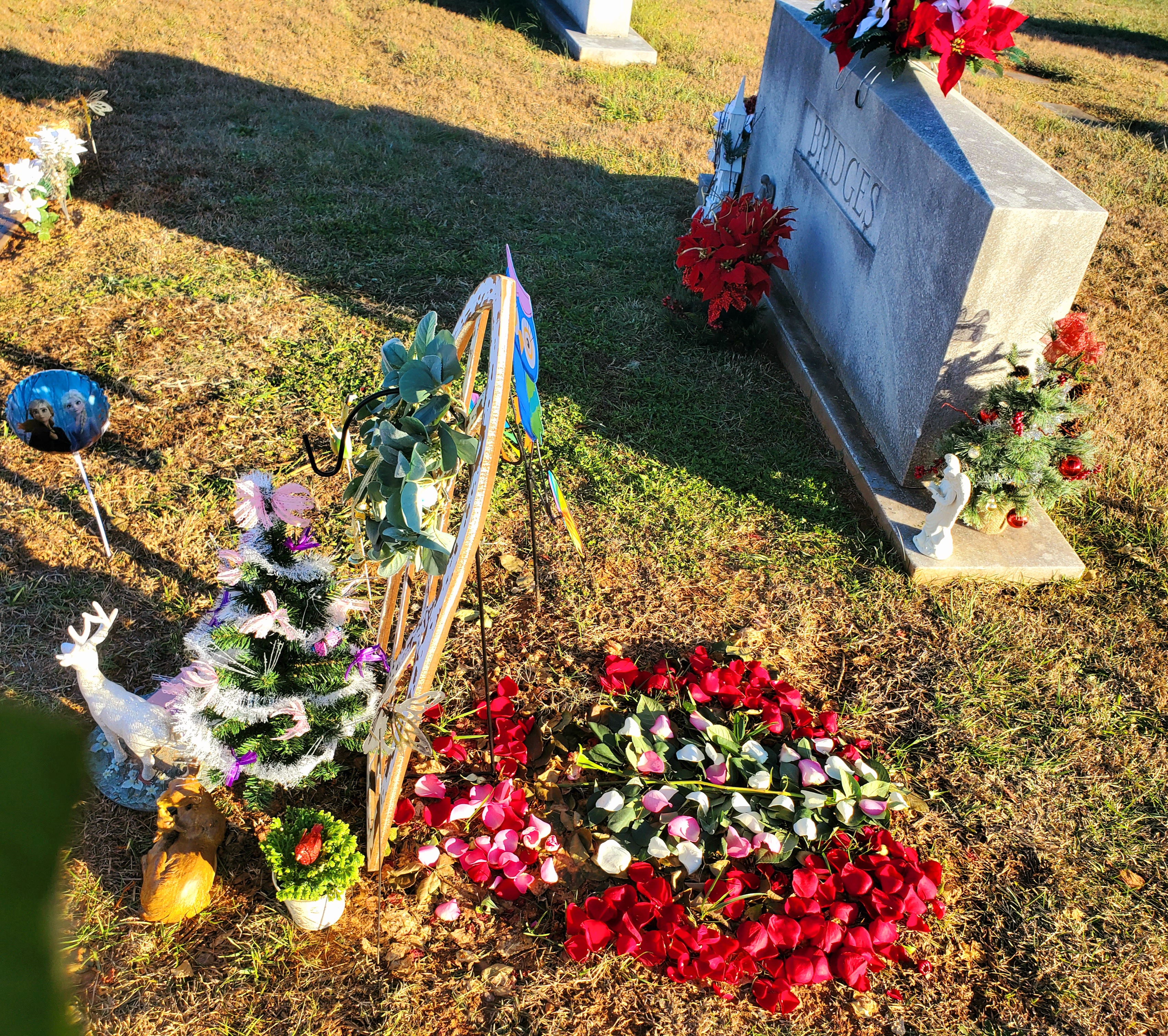 I added a Christmas tree the florist had made for her. I created the flower art with a Christmas tree. I love her so much.