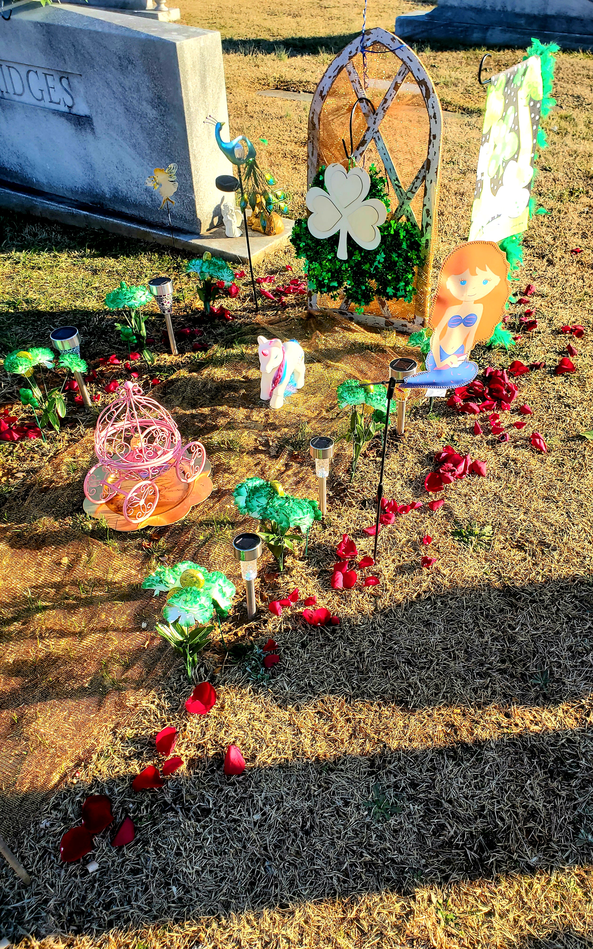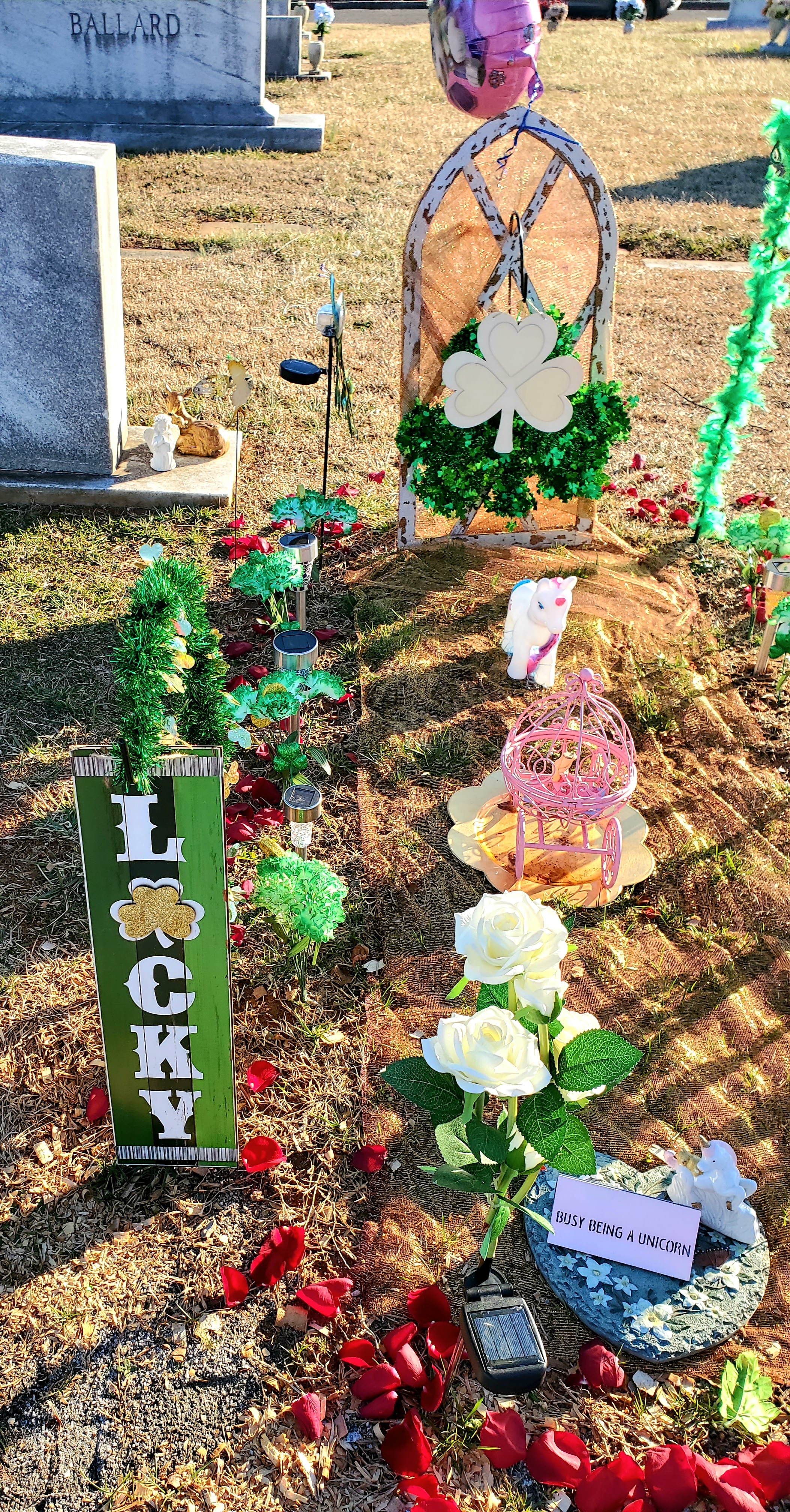 Every single piece we add to her grave symbolizes a part of Corrie. I buy a quarter from Hobby Lobby, a quarter from Amazon, roses from our local grocery store, and most from the Dollar Tree. When I bought the St. Patrick’s fake flowers, glitter from the coins got all over the hands of the cashier. I thought “That’s Corrie … Glitter everywhere.”