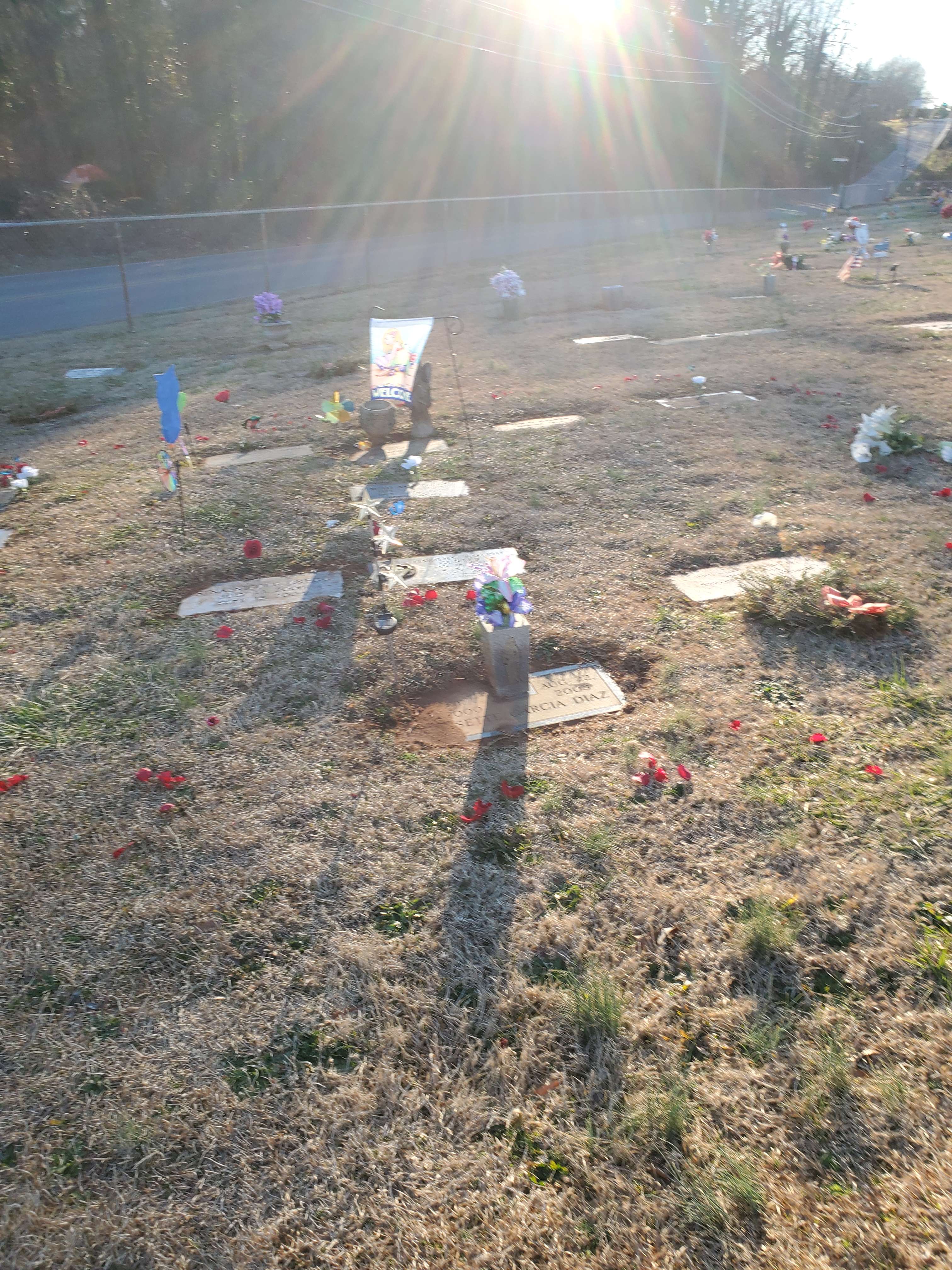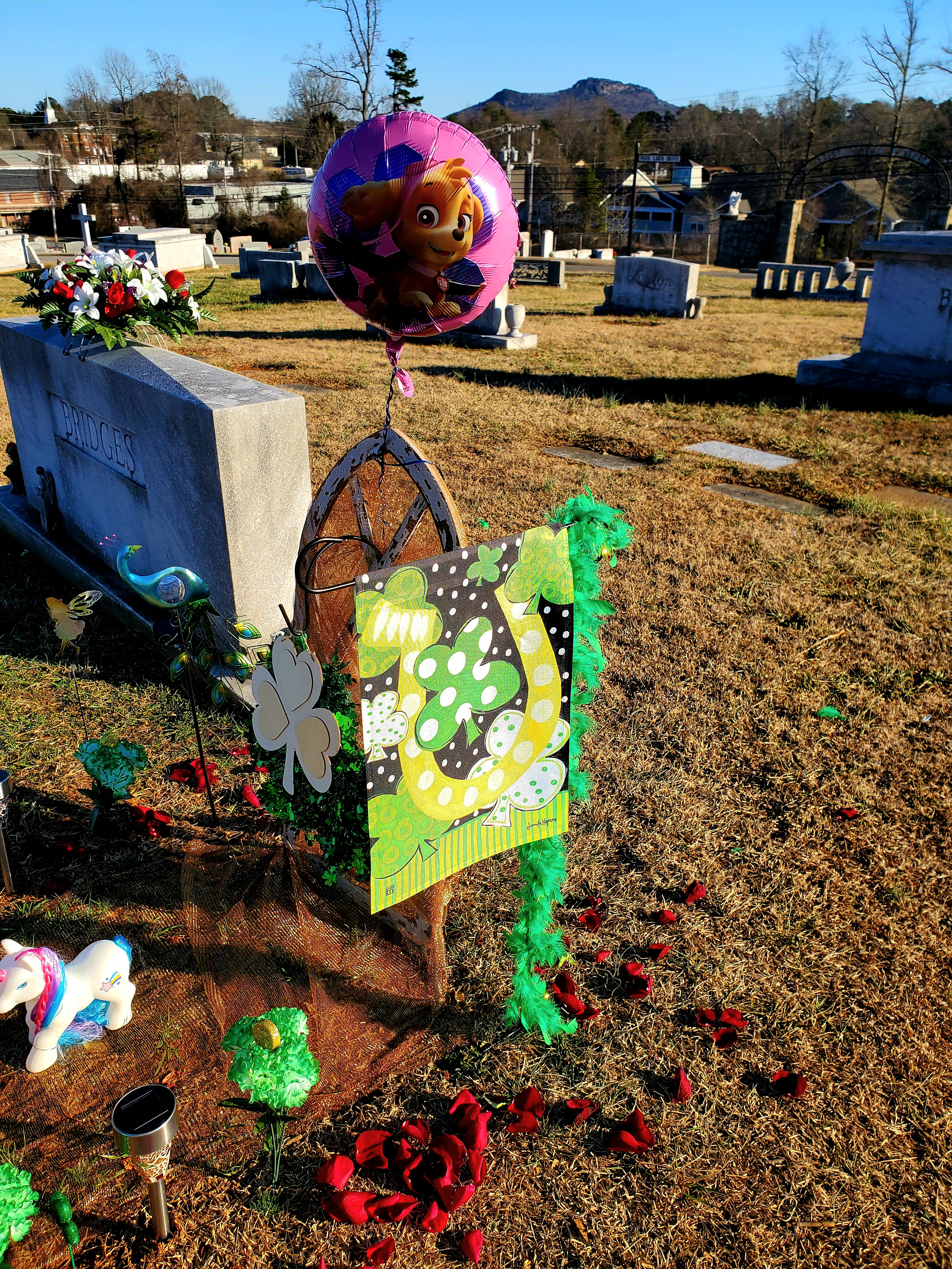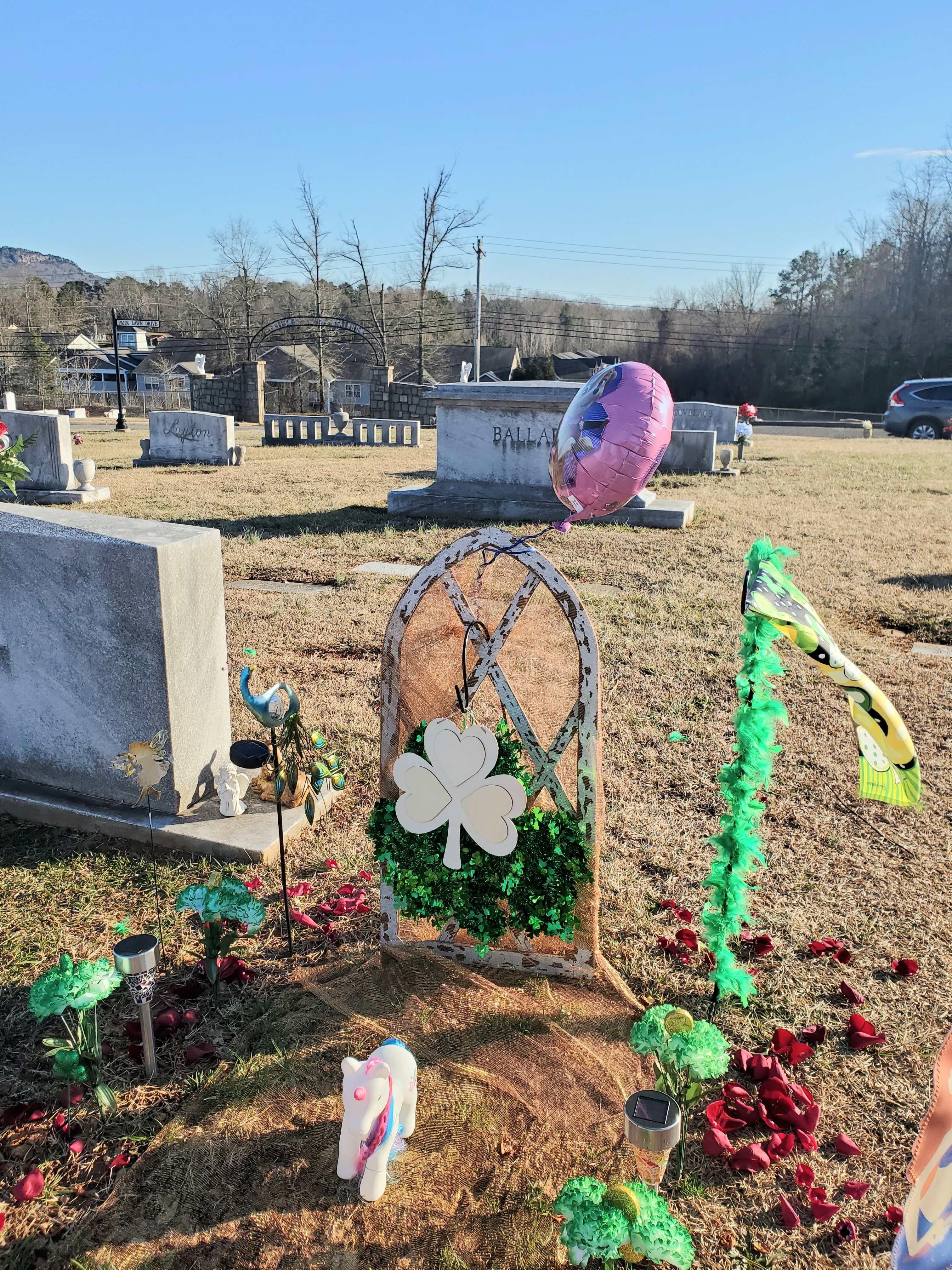 Corrie’s last preschool teacher joined me this Saturday to decorate Corrie’s grave. When I go to decorate Corrie’s grave, my vehicle is a mini-u-haul with a box of flowers and decorations from the previous season I can reuse. I have a box with different decorations, right now, for St. Patrick’s and roses for the petals we spread. I spread everything out near the top of the hill, and work from there.