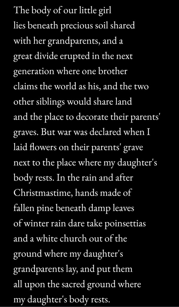 John, his sister, and our son also have a right to visit and decorate their parents’ grave. Representing my husband, I put poinsettias and a church at the head of his parents’ grave just as I did last year to honor them because it is emotionally hard for my husband. I’ve cut the grass around their graves just as I’ve done for Corrie, the 40 children and babies on Corrie’s Kinder Memorial Walk, and veterans buried near them.