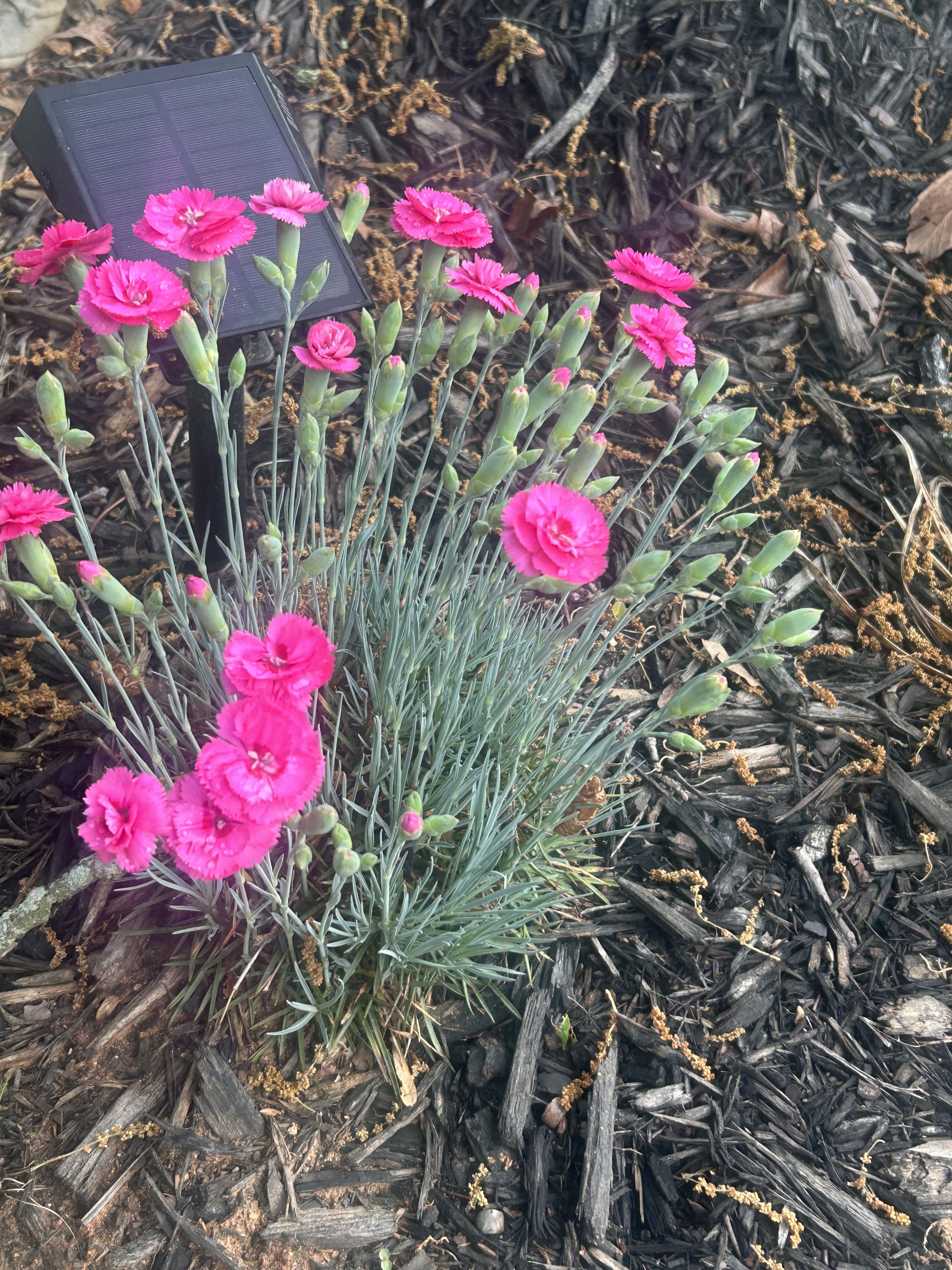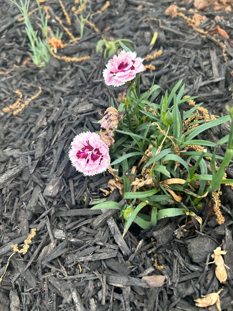 Pink Dianthus, which look to me like small roses, bloom in Corrie’s Butterfly Garden.