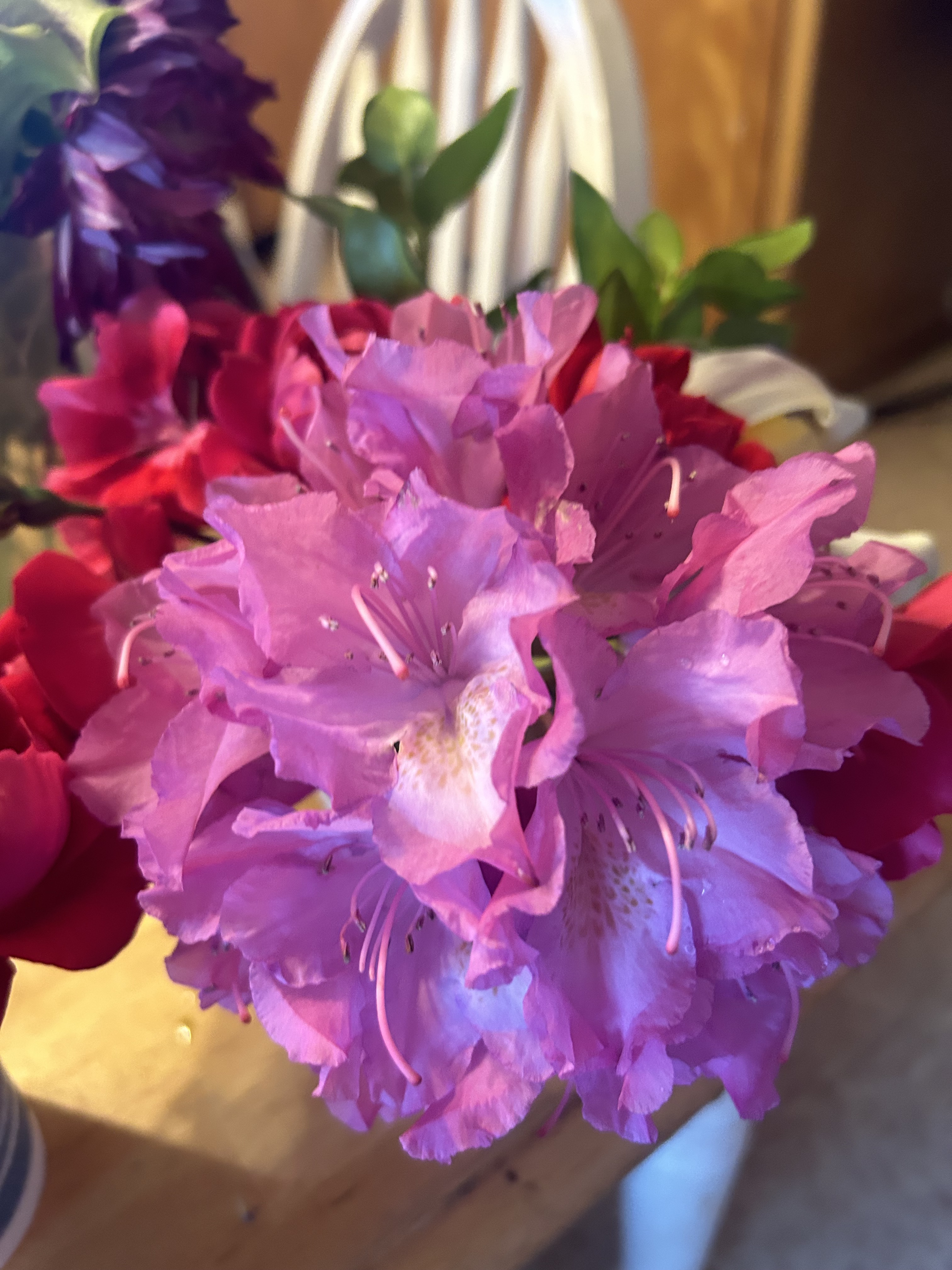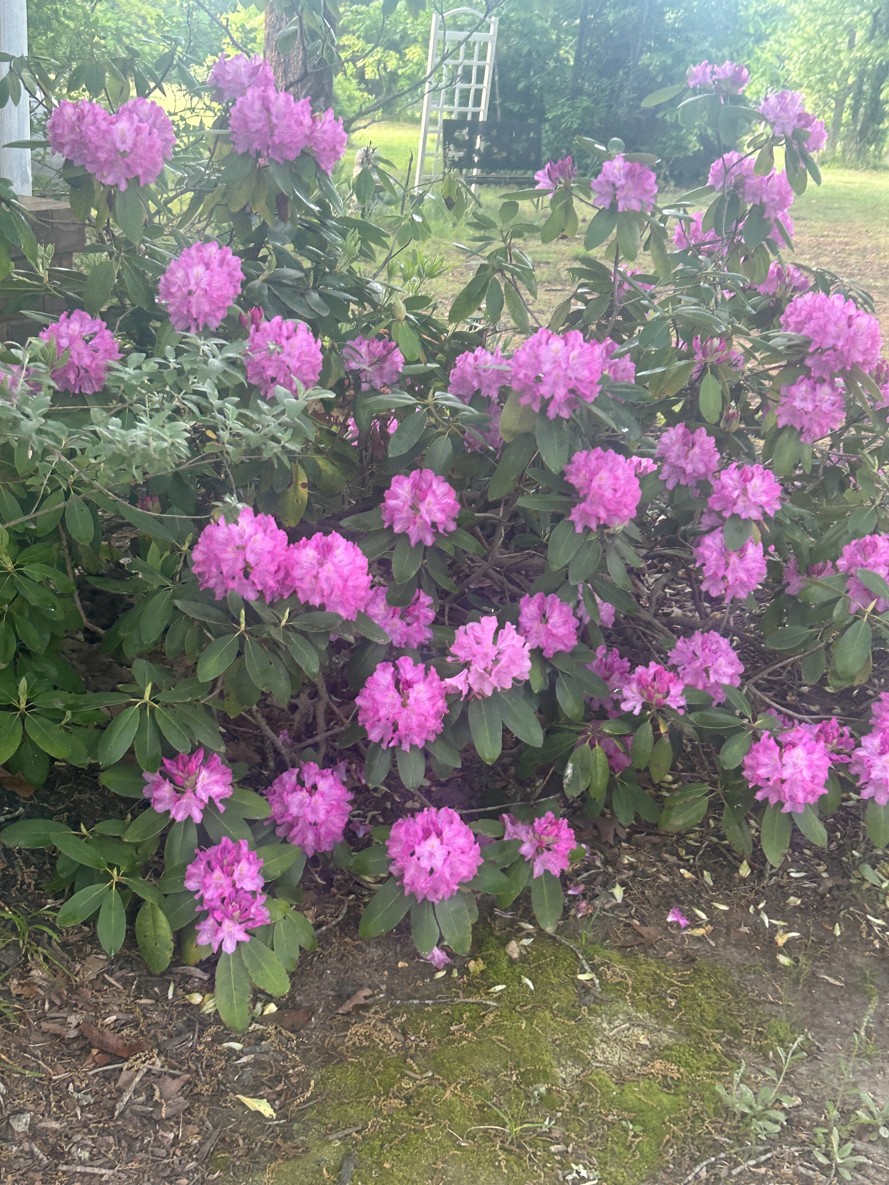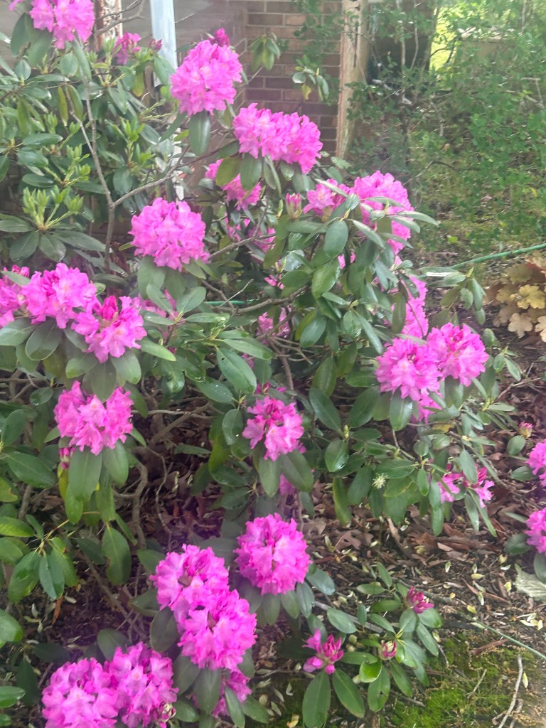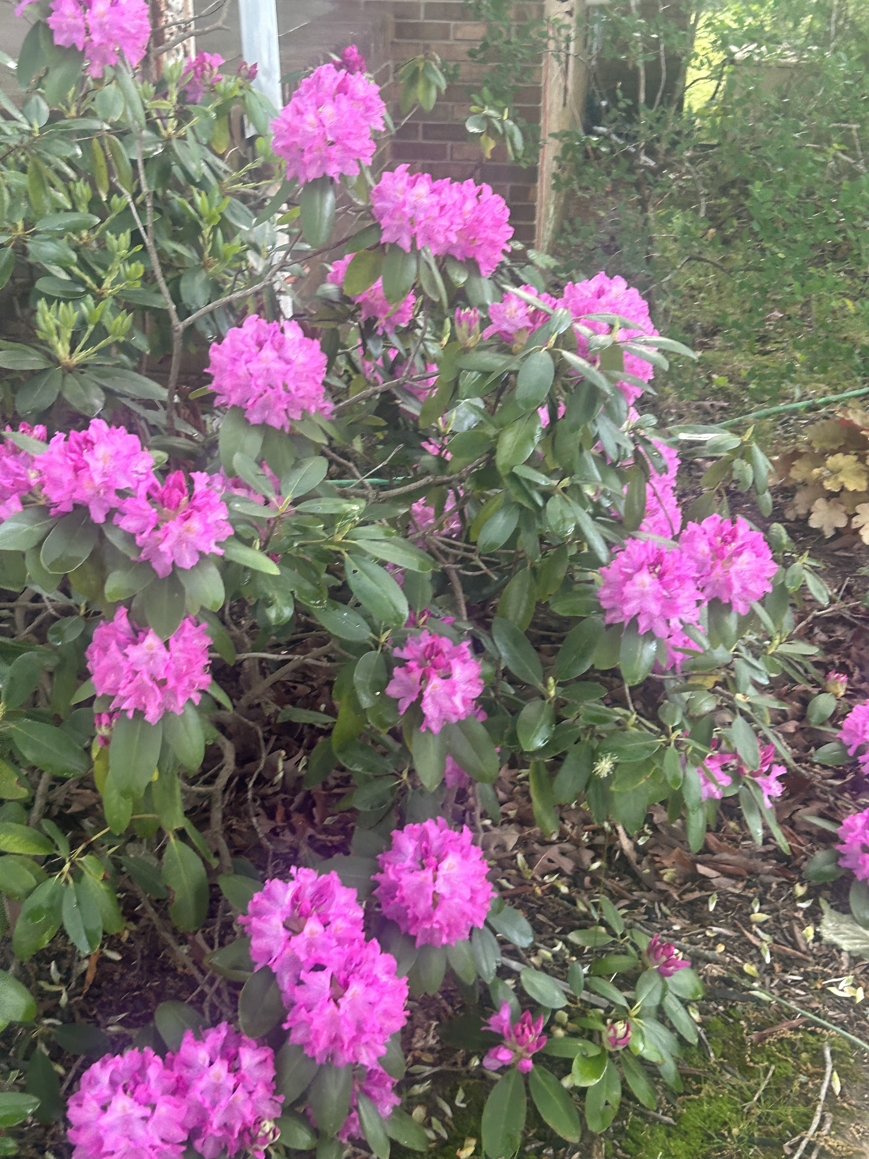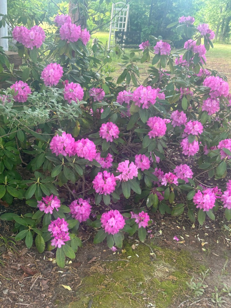 John’s mother’s Rhododendron blooms in front of the house, and at the entrance of the Cora Bell Garden, a shade garden.