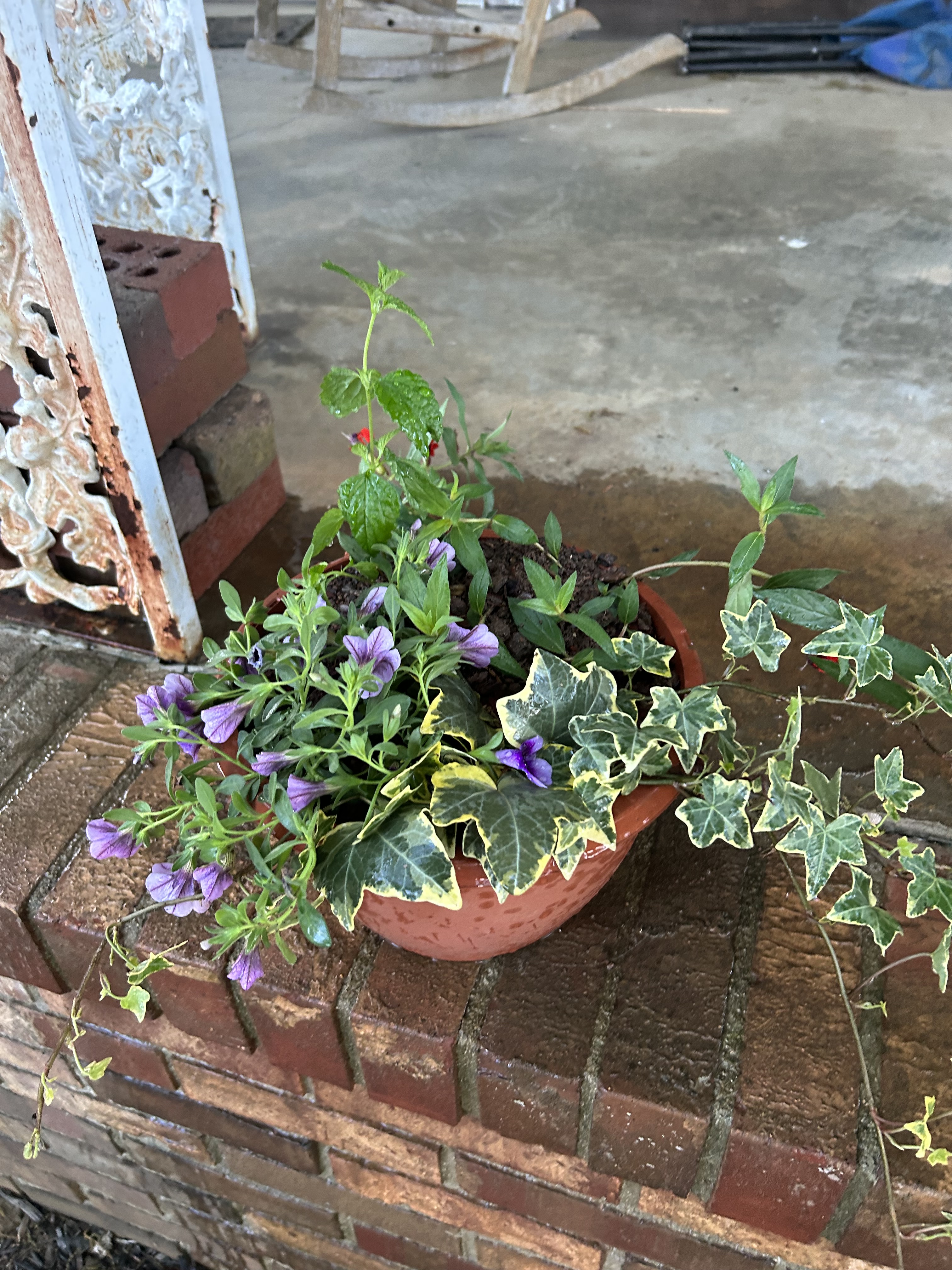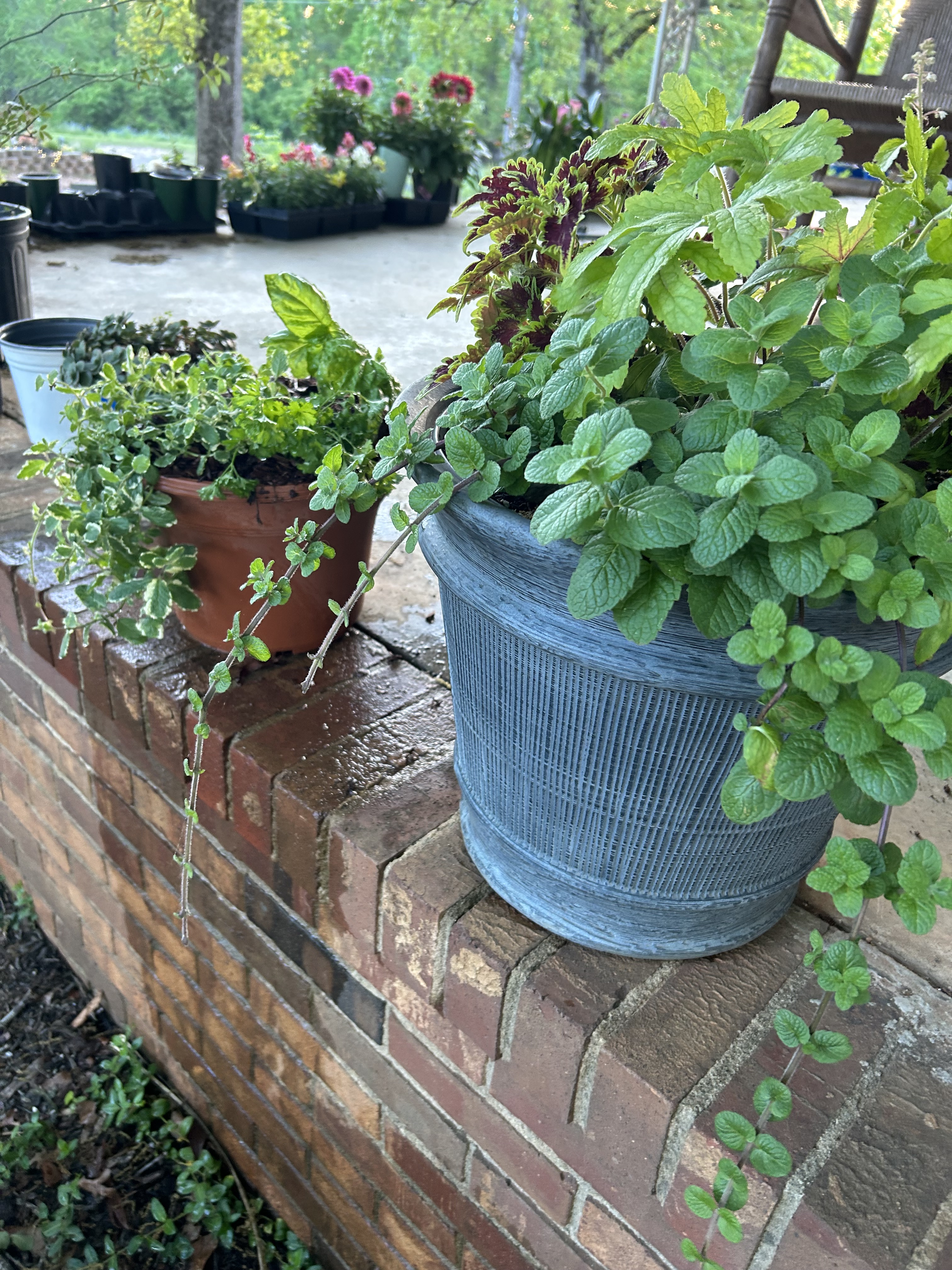 We’re fortunate to have a deep set front porch; the kind not made on houses anymore. The kind couples in old, romantic movies discuss in their dream home one day. I wanted to create my own containers instead of buying all of them, so I started with a Vermillionaire plant, which hummingbirds love, and lilies. Then I created my first herb container, as shown in the above picture.