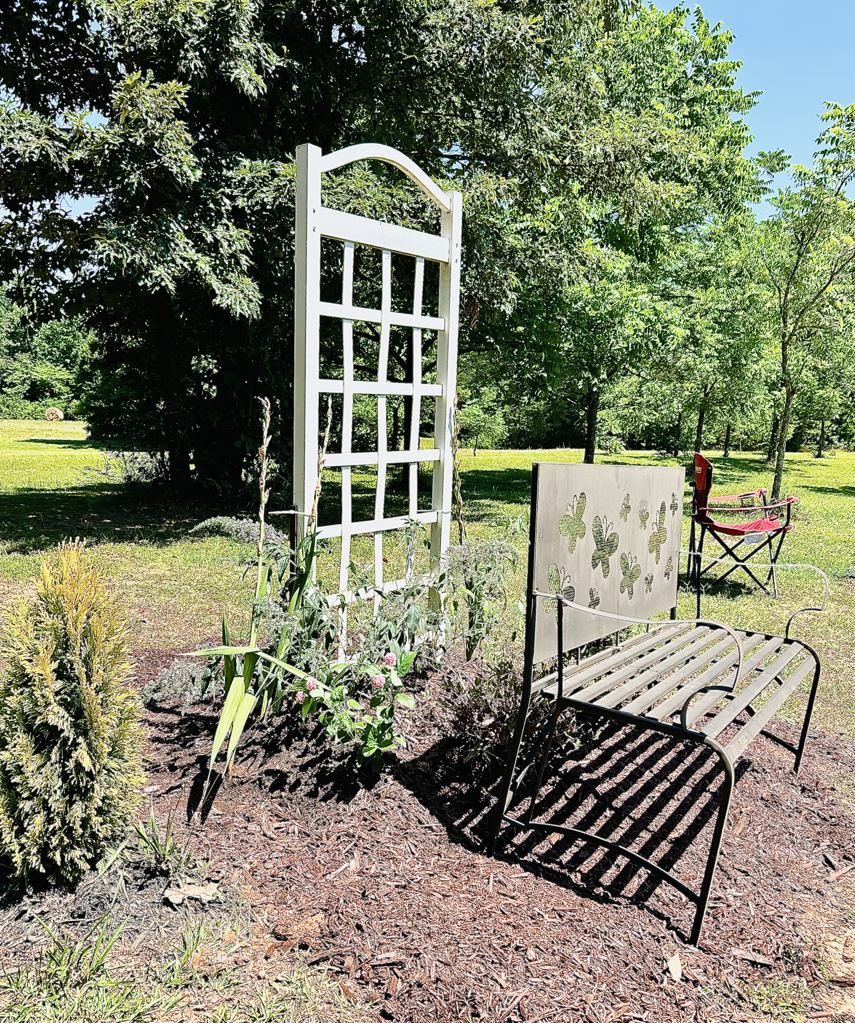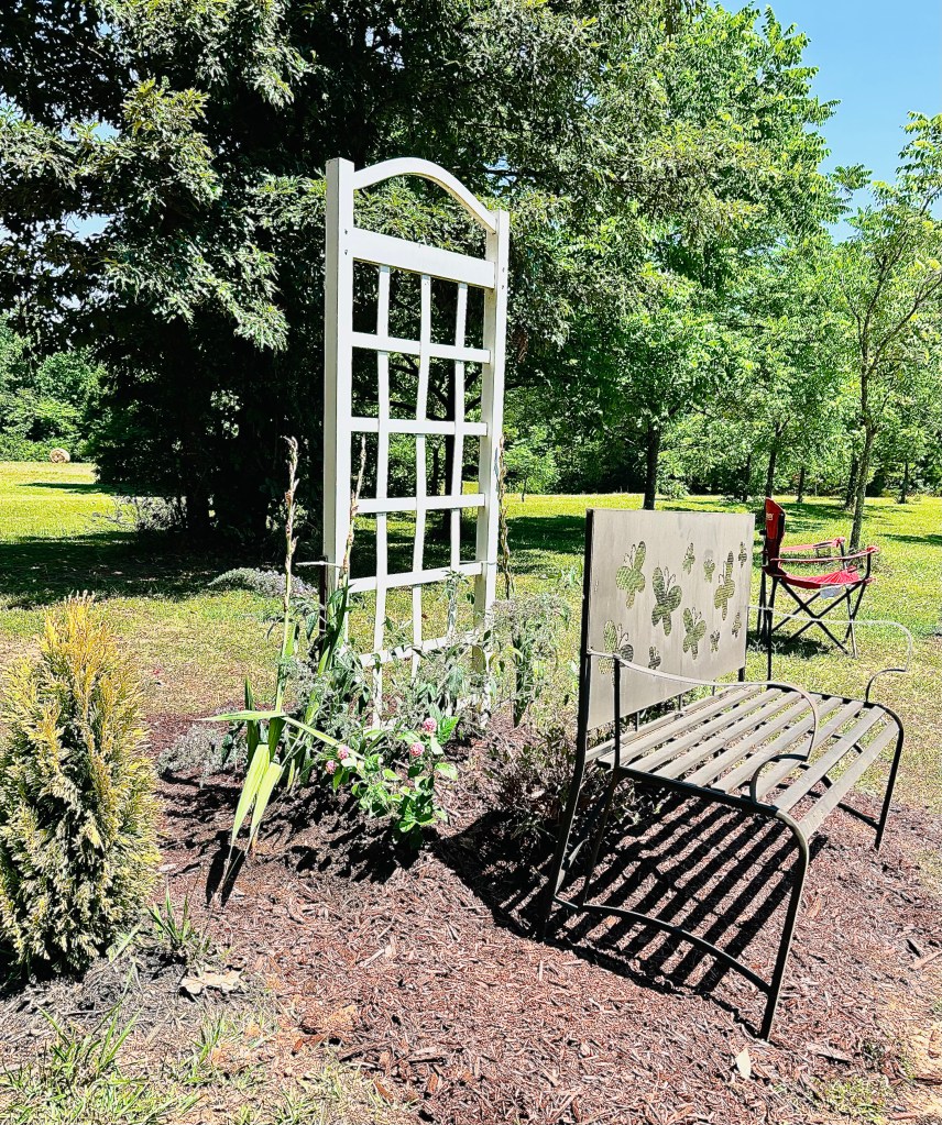 My son and I set up a no dig garden at the rose trellis and butterfly bench.