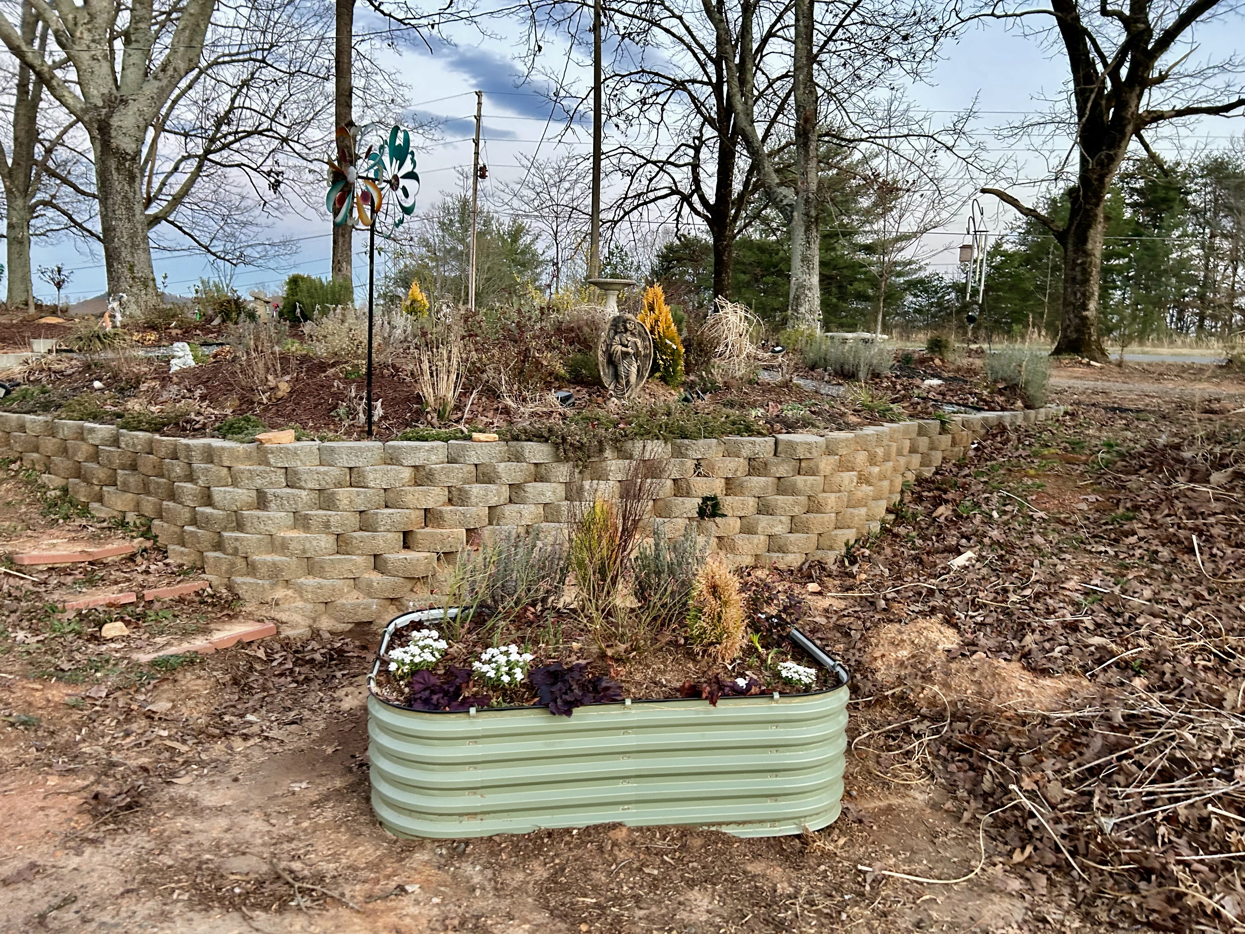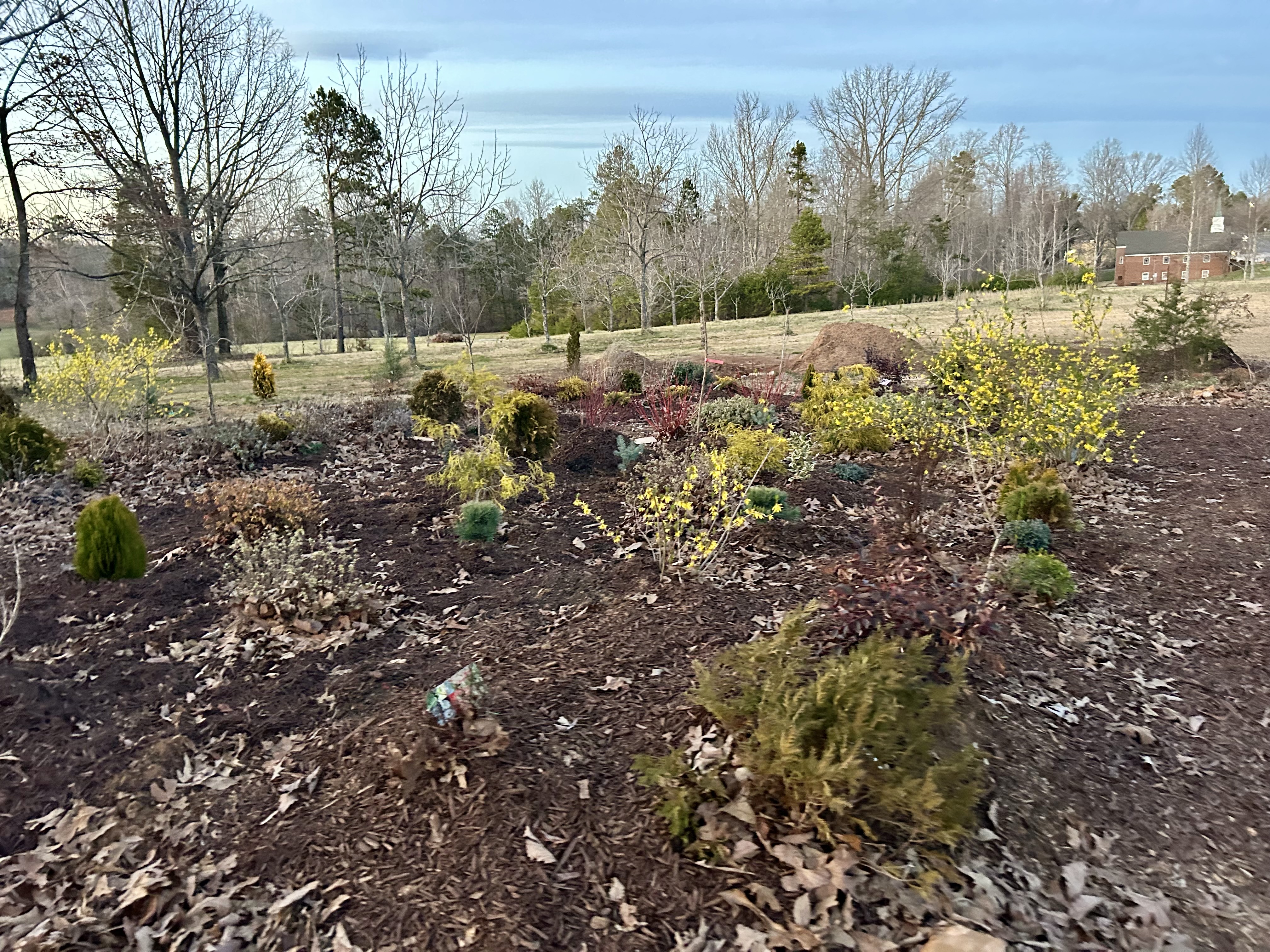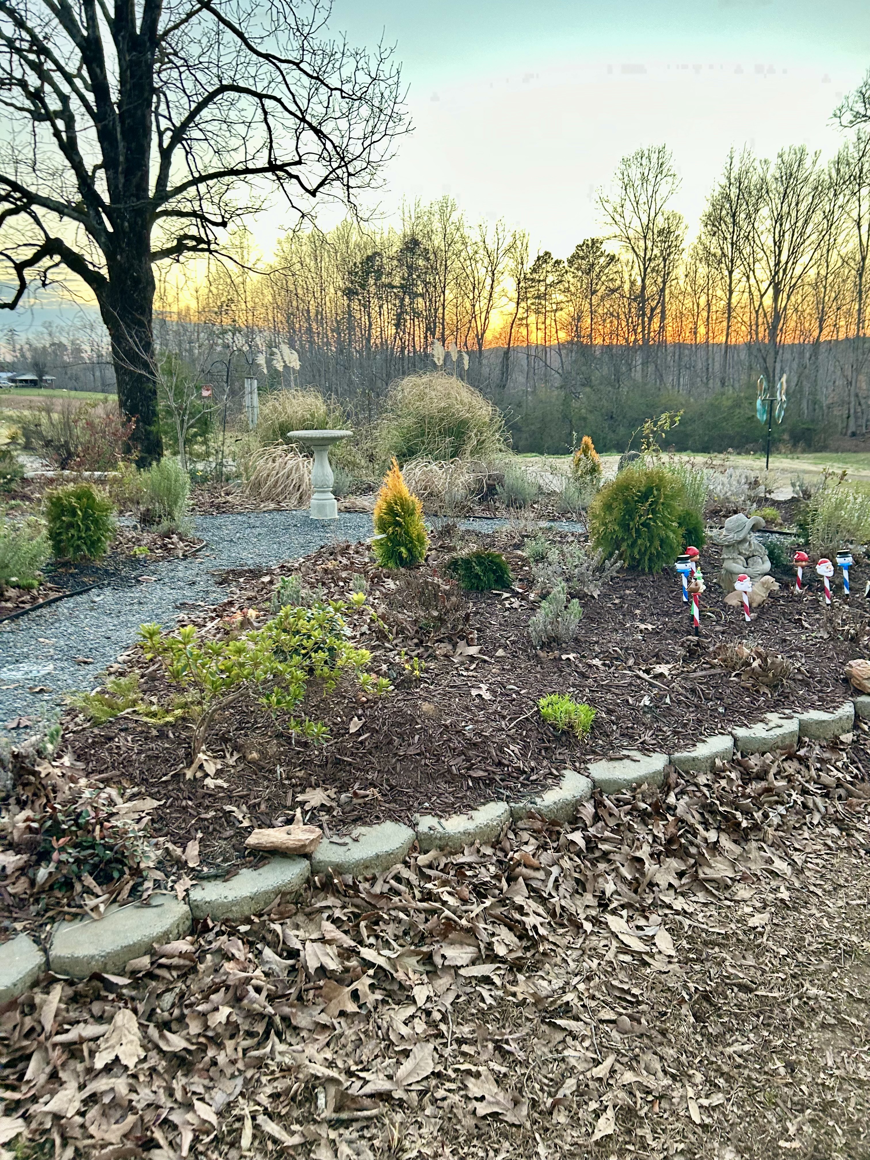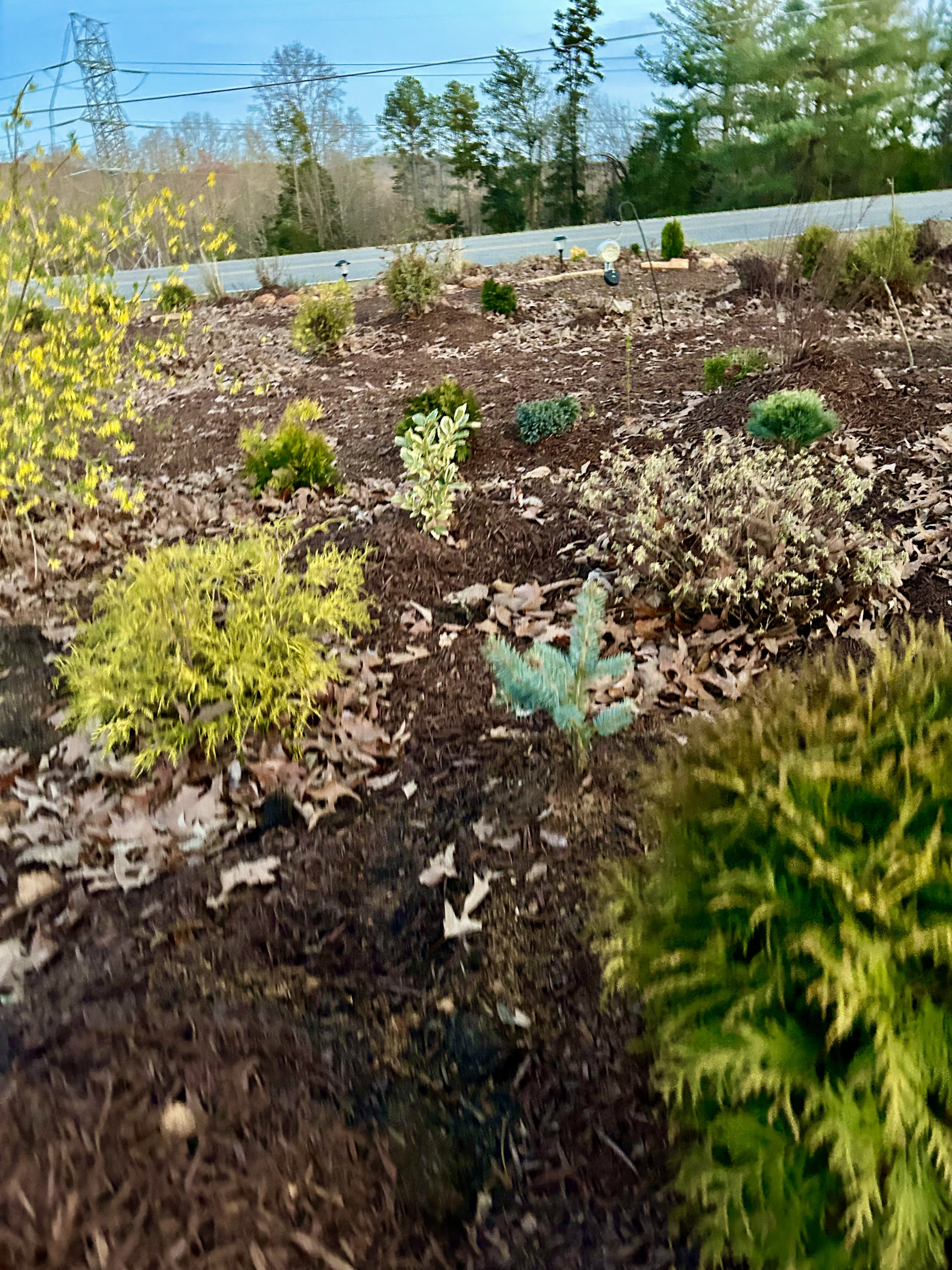 The Arendelle Garden is now two years old, and I had started planting certain plants directly in the red clay. I’d never do that now. In the Winter Garden (the third section), I have planted mostly evergreens. This season I’ve added blue green conifers to contrast the golden greens, such as Gold Mop False Cypress and Forever Goldy.